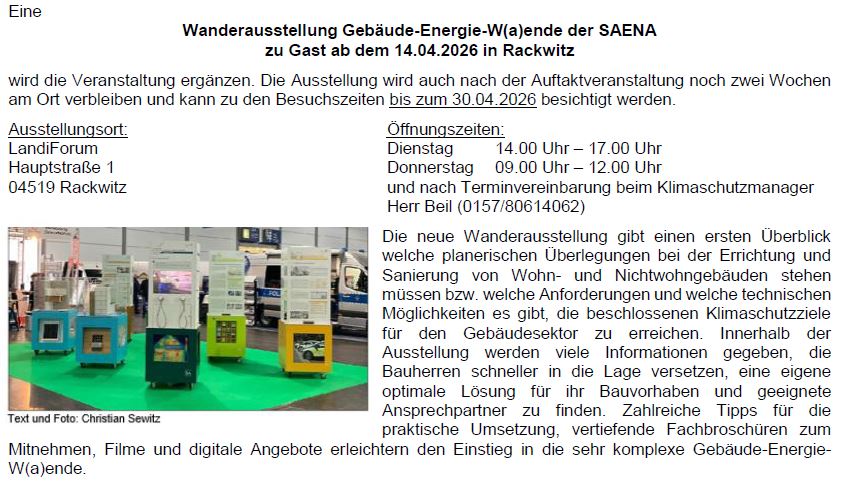 Eine Wanderausstellung der Sächsischen Energie-Agentur (SAENA) zum Thema Energiewende wird die Veranstaltung ergänzen. Die Ausstellung wird auch nach der Auftaktveranstaltung noch zwei Wochen am Ort verbleiben und kann zu den Besuchszeiten besichtigt werden.