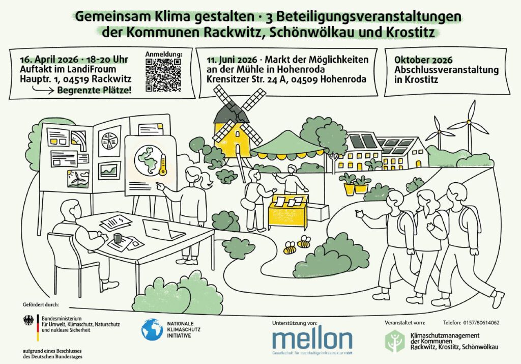 In der ersten von insgesamt drei Veranstaltungen in den Gemeinden Rackwitz, Schönwölkau und Krostitz sollen das Vorgehen bei der Erstellung des Klimaschutzkonzeptes sowie erste Erkenntnisse aus der Bestandsanalyse der drei Gemeinden vorgestellt werden. Zugleich wollen wir Ideen und Anregungen aus der Bevölkerung sammeln, denn die Aufgabe gelingt besser in gemeinschaftlicher Zusammenarbeit!